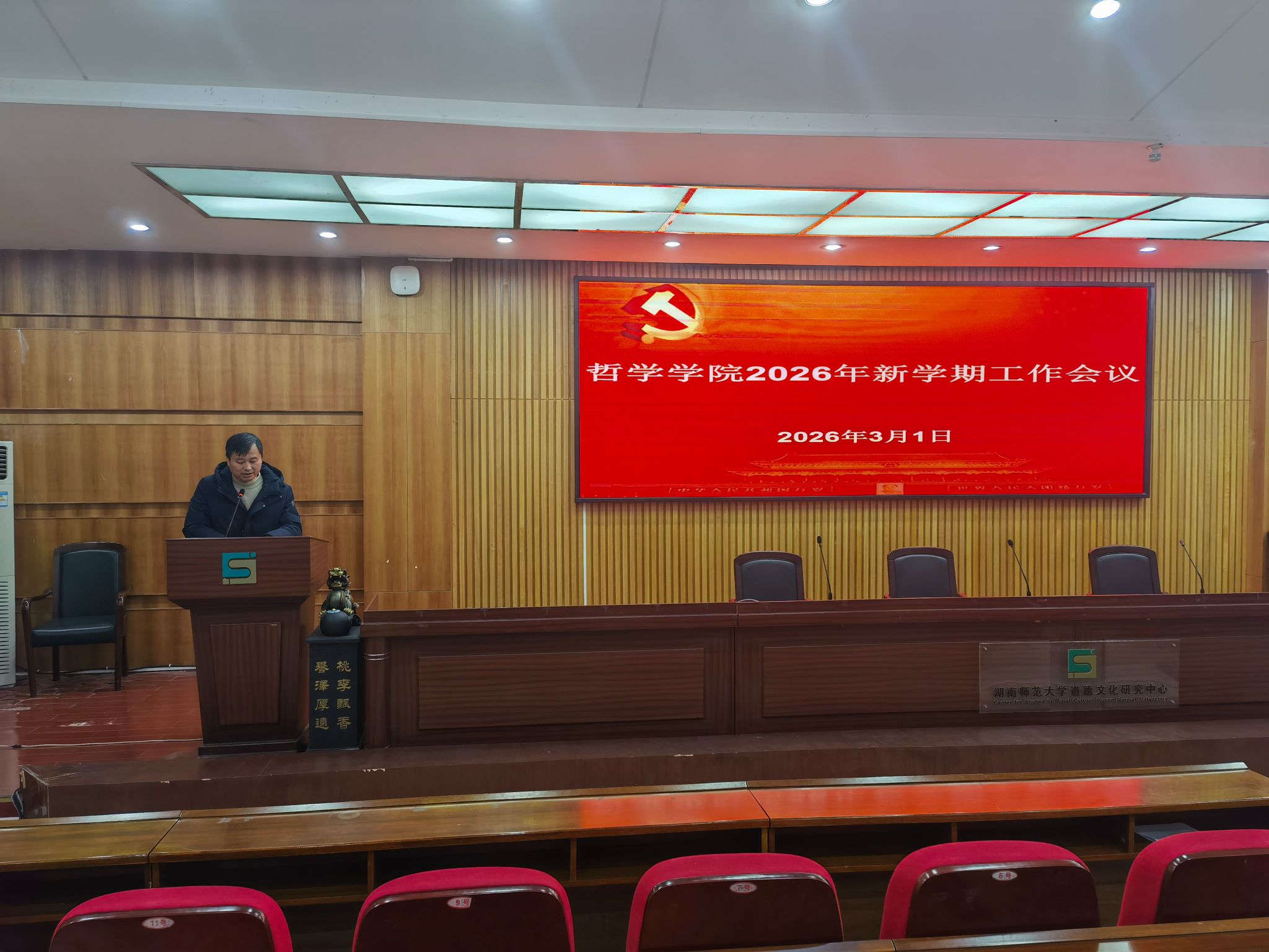 3月1日下午,哲学学院2026年新学期工作会议在学院报告厅顺利举行。会议由副院长文贤庆主持,党委副书记刘杰作工作报告,全院教职工参会聆听。会上,刘杰副书记首先向全体教职工全面传达了学校新学期工作会议的核心指示与精神要求,确保学校各项部署在学院落地生根。随后,他全面汇报了学院当前的建设进展与发展现状,客观分析了学院在高质量发展进程中面临的重点任务与突出难点,让全体教职工对学院发展形势有了清晰认知。会议...