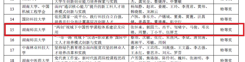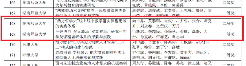 近日,湖南省教育厅公布了第十三届湖南省高等教育教学成果奖获奖名单,我校哲学系共有3项成果获奖。其中,张怀承团队的《“两创”视域下中国哲学课程体系建设及应用》获特等奖,向玉乔团队的《“西方哲学史”线上线下教学落实课程思政的实践体系》和毛新志团队的《三维协同多元联动双堂并举:研究生哲学类课程思政体系的探索与实践》获二等奖。
