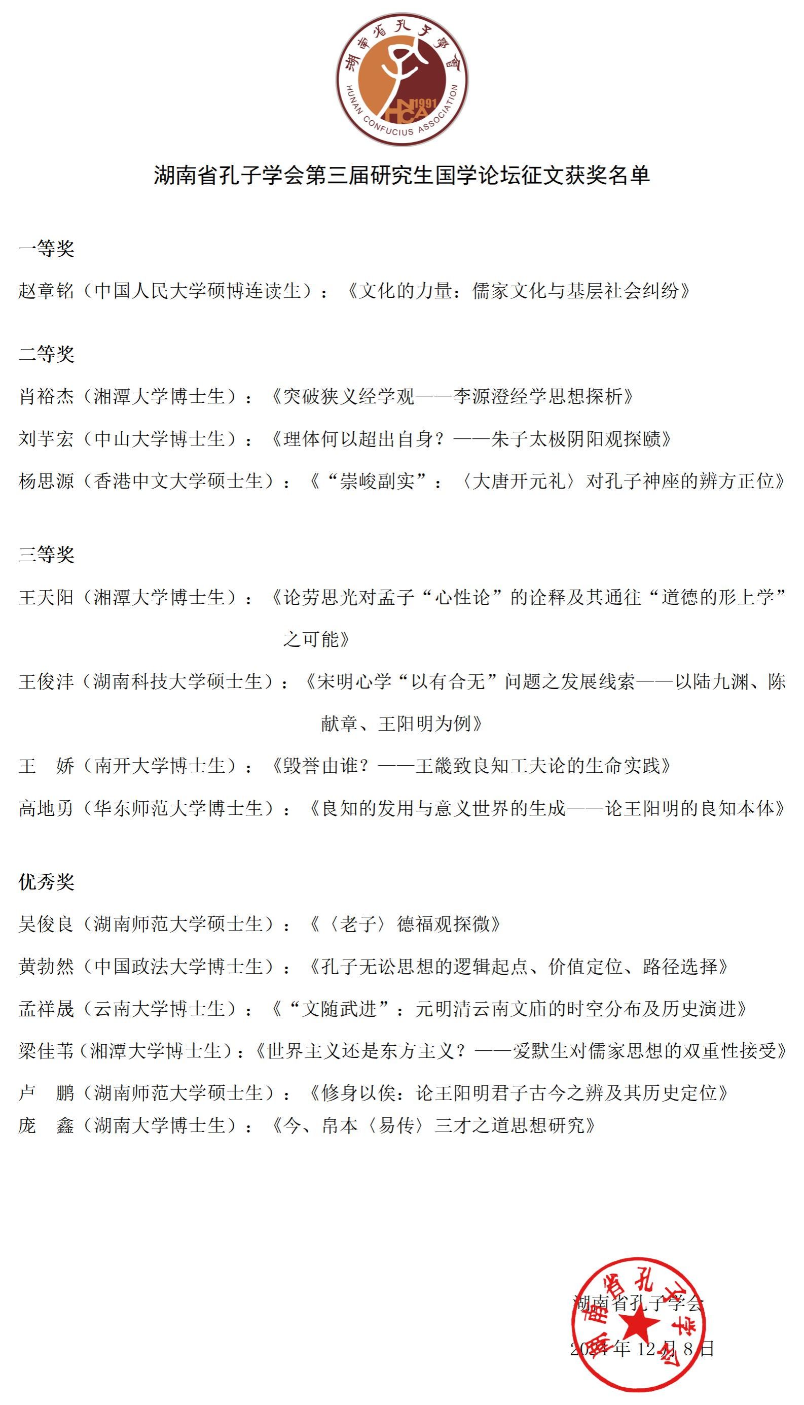 湖南省孔子学会第三届研究生国学论坛征文获奖名单